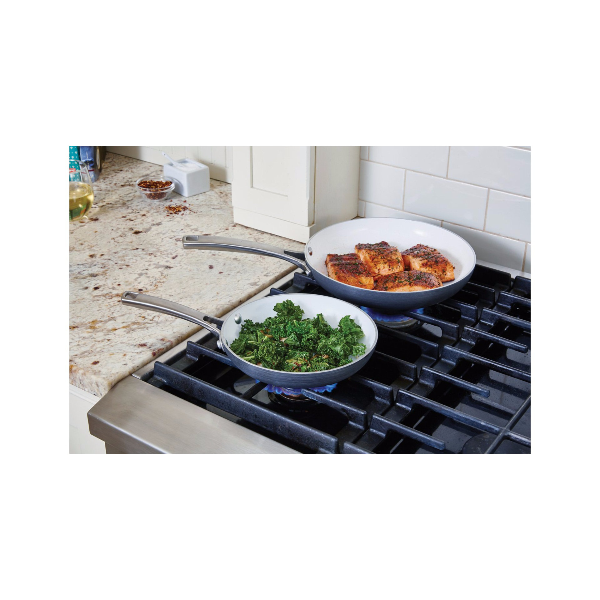 Web buy a set of two nonstick frying pans with dual layer coating, hard anodized aluminum construction, and stainless steel handles.